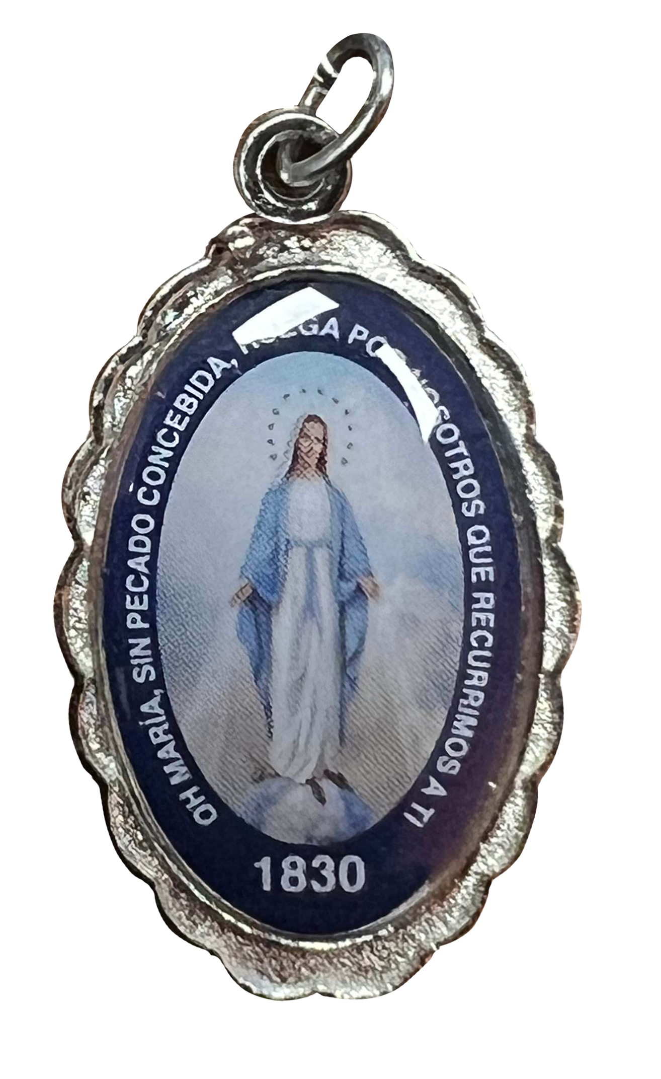 Spanish scalloped edge epoxy Miraculous Medal with a jump ring.