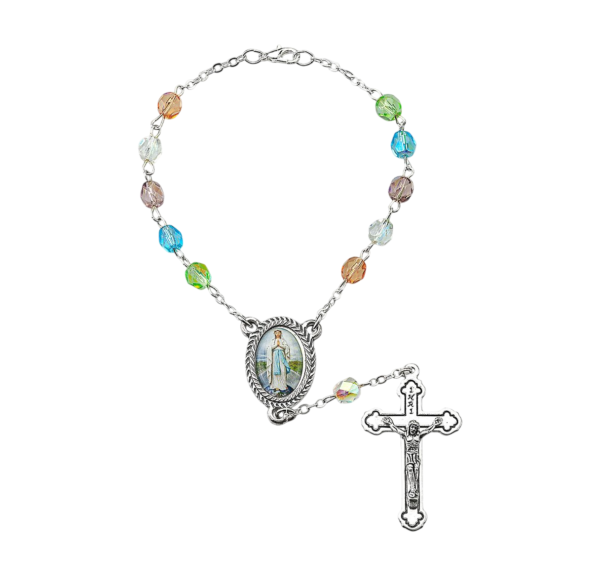 This Auto rosary has 6mm multicolored crystal beads and a center of Our Lady of the Highway