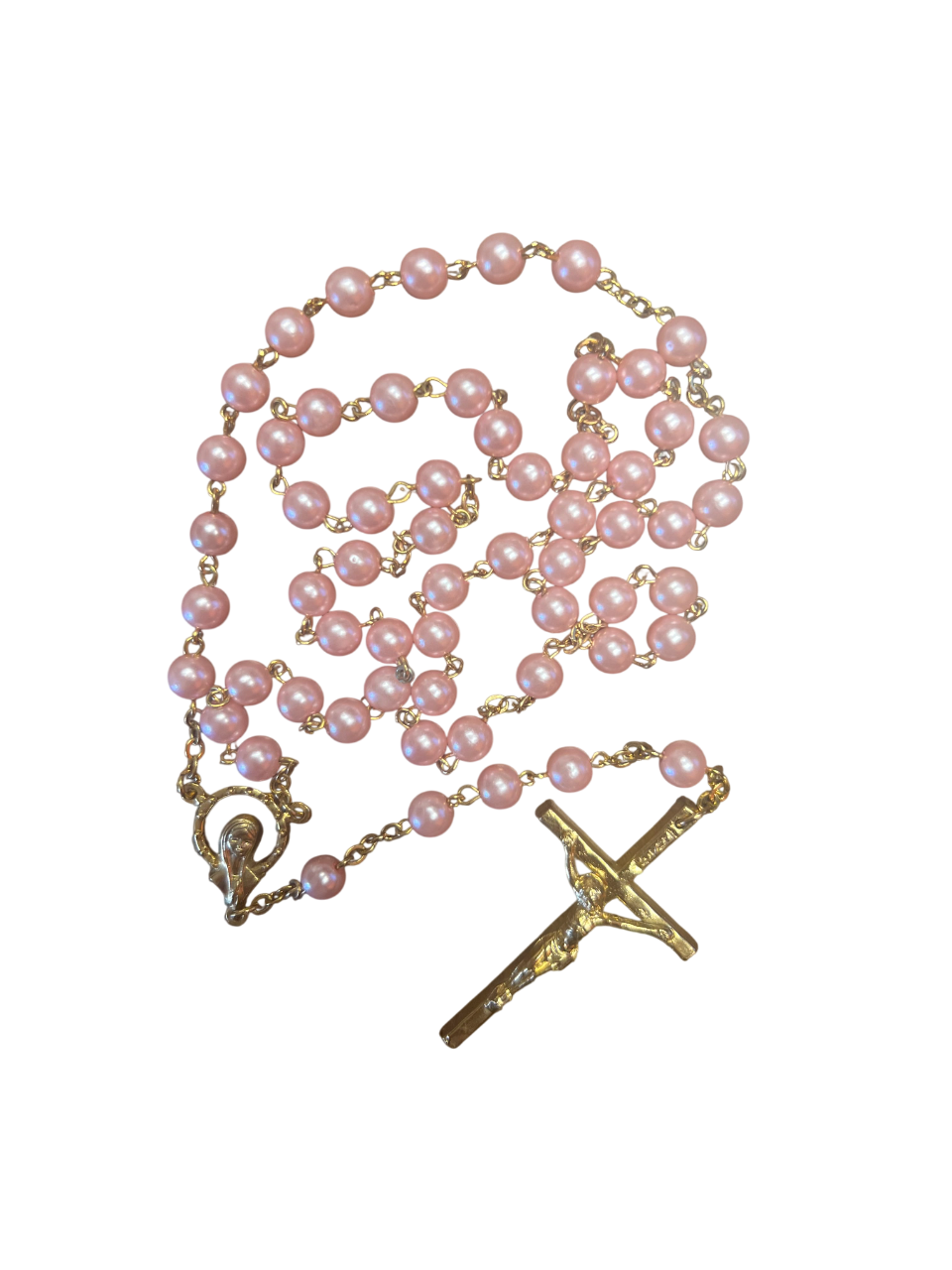 Pink pearl rosary with gold-tone accents. It measures 18 1/2 inches in length.