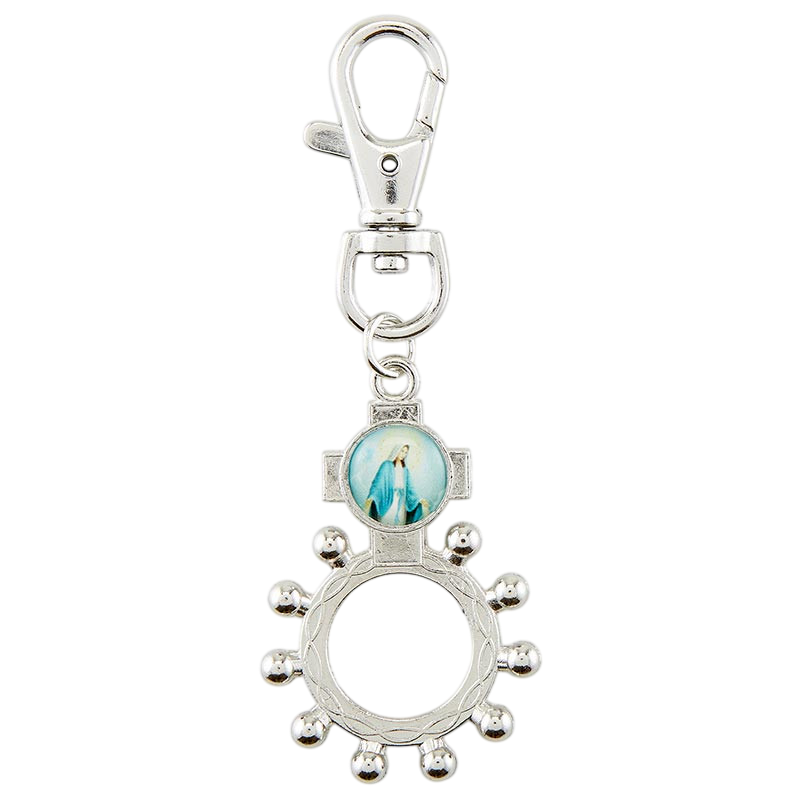Blessed Mother rosary ring with epoxy colored image and a lobster claw clasp. 3 1/2 inches