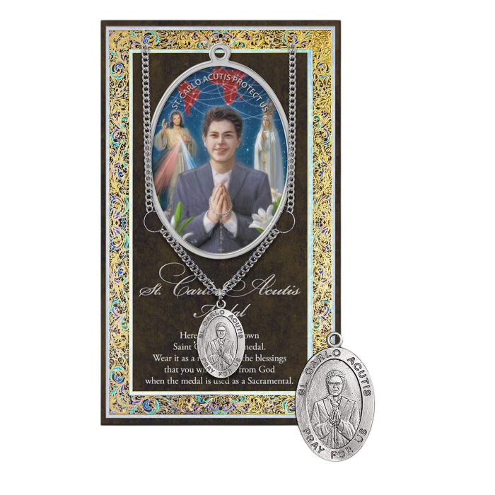 Saint Carlo Acutis lead-free pewter medal (1 × ½ inch) on a 24-inch stainless steel endless chain, packaged with a biography and prayer card in a clear pouch.