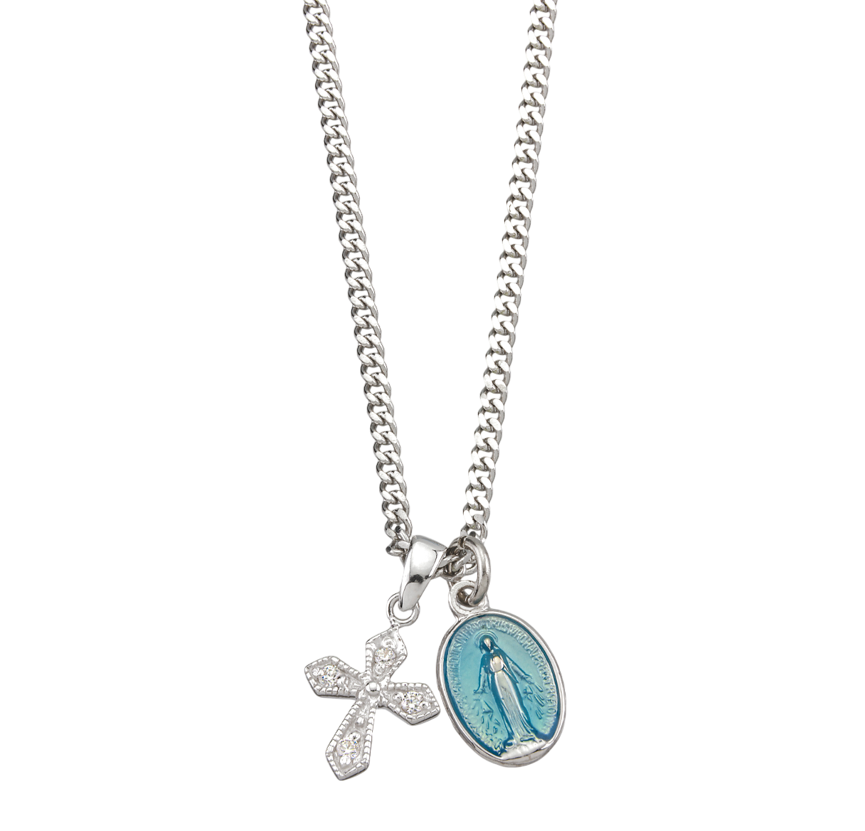This is a sterling silver, blue enamel Miraculous Medal. The cross pendant has tiny cubic zirconia stones. These come on a 20” surgical steel chain.