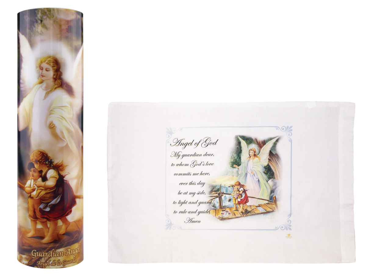 Includes one pillow case with an image of the guardian angel and traditional prayer. The case is 20″ x 30″. The LED candle is 8-1/4″ tall and features an image of the guardian angel. A prayer to the guardian angel is on the reverse side.
